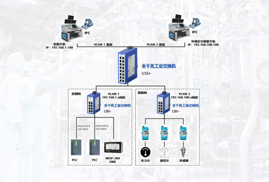实现制药机械内部的PLC等控制设备与上位机之间的控制网络通讯,还需要通过环境数据网络,为采集与生产相关的环境安全数据的外协设备提供通讯支持.
